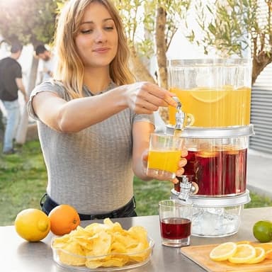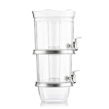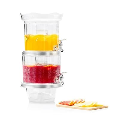 En komplet drikkevaredispenser til dobbelte drinks. Beholderen har to uafhængige beholdere for to forskellige drikkevarer og to tappehaner. Den centrale isbeholder gør at drikkevarerne kan afkøles uden at de bliver opspædet med for meget vand. Låget kan anvendes som bakke til snacks. Derudover har beholderen en uafhængig isbeholder længst nede. Det er nemt at sætte delene sammen og skille dem ad igen når beholderen skal rengøres og opbevares.