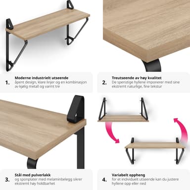 De enkle hængende væghylder i Irvine-sættet fra tectake imponerer med deres smarte udnyttelse af pladsen og deres charmerende udseende. Ved at kombinere køligt stål og varmt træ skaber denne duo af hylder en harmonisk kontrast på dine vægge. De to hylder er ideelle til at præsentere indendørs planter, fotos og andre yndlingsgenstande. Disse hylder skaber derfor ekstra plads til opbevaring i hjemmet, og de passer ind i enhver indretning. Den gode spændstighed af disse hylder og store modstandsdygtighed over for ridser og snavs gør disse to hængende hylder fra tectake ikke kun til en stilfuld, men også en praktisk idé.
