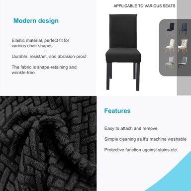 Det elastiske stolebetræk garanterer hurtig tildækning og et godt hold, samtidig med at det får selv gamle stole til at se ud som nye. Samtidig beskytter det mod støv, pletter, ridser og falmning med tiden.