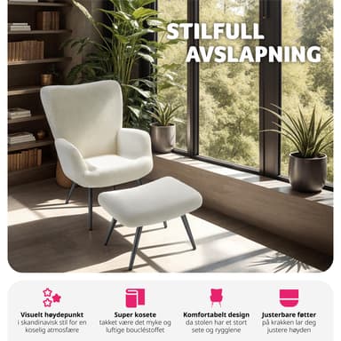 Det bløde bouclé-stof føles ikke kun blødt, men er også særligt nemt at vedligeholde – ideelt til daglig brug. Med sin rummelige, buede rygstøtte og de indbydende armlæn giver lænestolen dig optimal støtte til en ergonomisk kropsholdning. Den højdensitets skumfyldning sikrer en behagelig polstring,som gør det yderst behageligt at sidde i stolen i timevis, imens skamlen med præcist justerbare udligningsskruer fungerer som en praktisk fodstøtte og fuldender din afslapningsoplevelse.