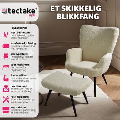 Bring skandinavisk hygge ind i din stue med lænestolen Hygge med skammel fra tectake! Dette siddemøbel kombinerer stilfuldt design med højeste komfort og er den perfekte tilføjelse til afslappende timer derhjemme.