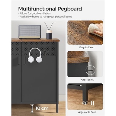 Det perforerede stålpanel på bagsiden tilføjer både stil og funktion, da det giver mulighed for god ventilation og kan suppleres med kroge (medfølger ikke) til ophængning af mindre genstande som nøgler eller hovedtelefoner.