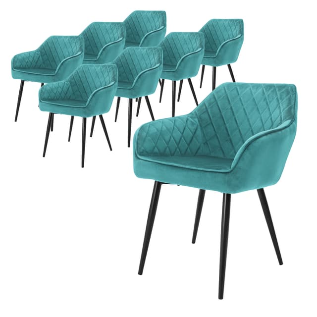 ML-Design Sæt med 8x Petroleumsspisestole - Moderne stil - Polstret ryg og armlæn i fløjlslook - Sorte metalben - Ergonomisk stol - Moderne lænestol Stue/soveværelse/køkkenLæs mere om produktet