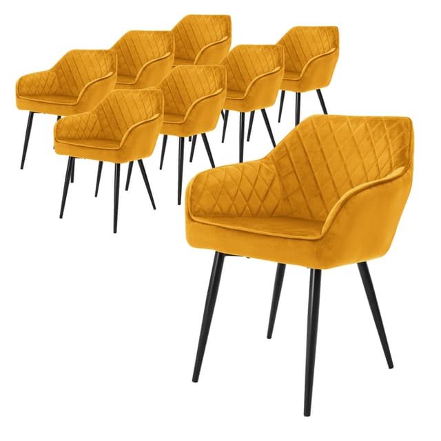 ML-Design sæt med 8x spisebordsstole - sennep - moderne stil - polstret ryg og armlæn i fløjlslook - sorte metalben - ergonomisk stol - moderne lænestol til stuenLæs mere om produktet