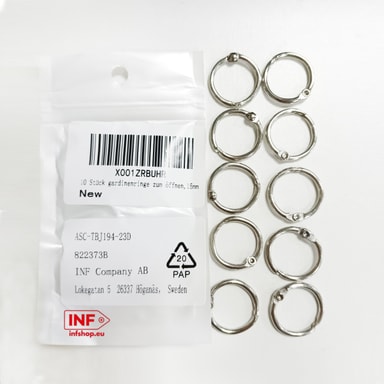 10-pak gardinringe af slidstærkt metal med anti-rust behandling. Kan åbnes og lukkes for at fastgøres til gardinstangen. Kan også bruges som ringe til badeforhæng eller til forskellige gør-det-selv-projekter.