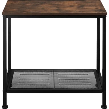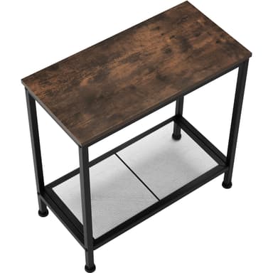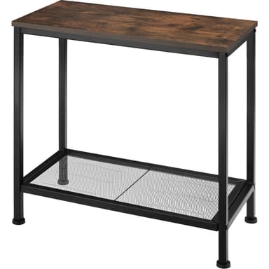 Det smalle Filton sidebord fra tectake forvandler diskrete hjørner og nicher til smarte blikfang eller brugbar opbevaringsplads. To niveauer på dette sidebord tilbyder en fremragende baggrund for præsentation af planter, billeder og andre elskede ting eller fungerer som en hylde til hverdagsgenstande. Kontrasten mellem den stabile spånplade med dens attraktive fibre og den kølige ramme af sort stål giver den solide konstruktion sit særlige look i typisk industriel stil. De fire skruefødder i plast beskytter gulvet og sikrer, at det opretstående sidebord altid er i balance.