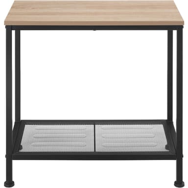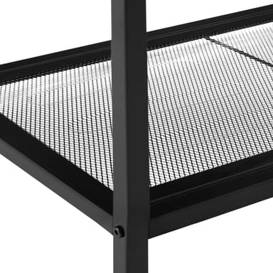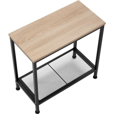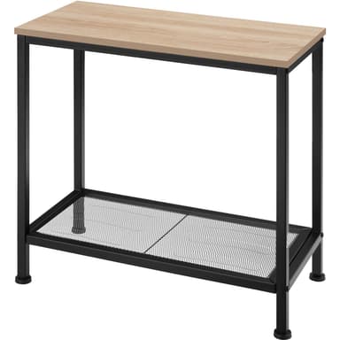 Det smalle Filton sidebord fra tectake forvandler diskrete hjørner og nicher til smarte blikfang eller brugbar opbevaringsplads. To niveauer på dette sidebord tilbyder en fremragende baggrund for præsentation af planter, billeder og andre elskede ting eller fungerer som en hylde til hverdagsgenstande. Kontrasten mellem den stabile spånplade med dens attraktive fibre og den kølige ramme af sort stål giver den solide konstruktion sit særlige look i typisk industriel stil. De fire skruefødder i plast beskytter gulvet og sikrer, at det opretstående sidebord altid er i balance.