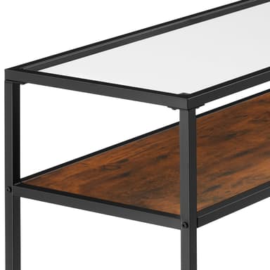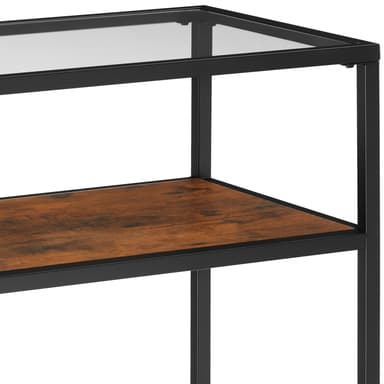 Pift dit hjem op med det fine Kilkenny sidebord fra tectake. Konstruktionen af dette sidebord, der er designet i typisk industriel stil, er særligt imponerende med sin øverste hylde lavet af glas, hvorigennem træ-look-hylden nedenunder også er synlig. Det pulverlakerede stålstel i kølig sort giver det smalle gangbord god stabilitet og et klart defineret stel. På trods af valget af højkontrastmaterialer åbner det minimalistiske design af det fine sidebord næsten ubegrænsede kombinationsmuligheder – en indretningsidé med en stærk karakter: det bemærkelsesværdige Kilkenny sidebord fra tectake.