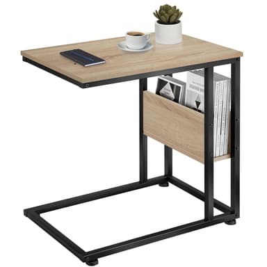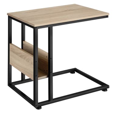 Det bemærkelsesværdige sidebord Wigan fra tectake giver personlighed til dit interiørdesign. Takket være sin asymmetriske C-form kan det karakteristiske sidebord i den industrielle stil nemt skubbes ind under lænestolen, sofa eller sengen. Den robuste hylde til opbevaring og det rummelige sidebord med det fine åre i trælook udstråler naturlig charme og harmonerer perfekt med det sorte stel af massivt stål på dette sidebord. De fire plastikfødder kan justeres med millimeterpræcision for at sikre maksimal stabilitet - det ideelle bord som supplement til en hyggelig aften foran tv'et som sofabord: det praktiske sidebord Wigan fra tectake.