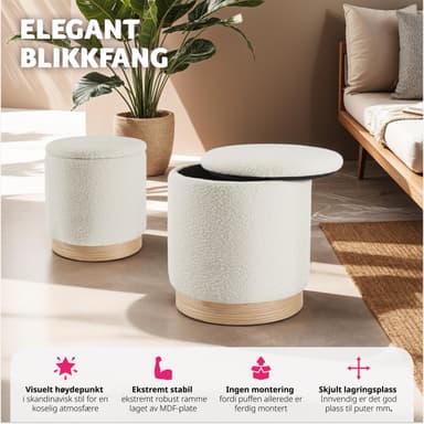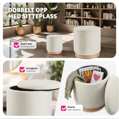 De aftagelige låg er meget komfortable takket være skumgummipolstringen, og nedenunder er der rummelige opbevaringsrum, som er ideelle til opbevaring af tæpper,puder eller andre boligtilbehør. Stelene af robuste MDF-plader sikrer høj stabilitet og bæreevne, mens soklerne i trælook giver denne siddepuf både hyggelig charme og høj stabilitet.