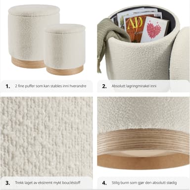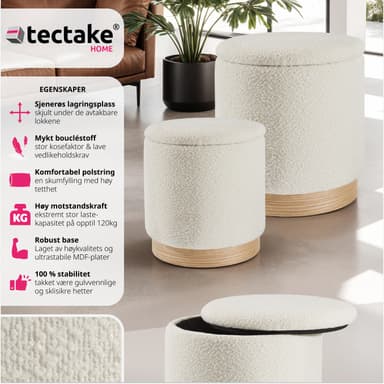 Opdag det 2-delte sæt skammel Orchide fra tectake og bring elegance og funktionalitet ind i dit hjem. Disse alsidige skamler kombinerer fremragende design med praktiske egenskaber. Med høj kvalitet bouclé-stof, tilbyder møblerne en blød overflade, der kræver minimal vedligeholdelse og alligevel tilføjer et elegant touch til dit hjem.
