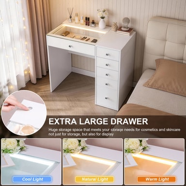 Midtskuffen er udstyret med 3-farvet LED-lysstribe, der understøtter kaldt, varmt og naturligt lys, og skaber blød atmosfærelys til soveværelse og sminkeområde.