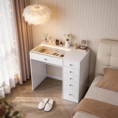 Dette sminkebordssæt kan bruges som helhed eller placeres separat, så du kan lave en personlig indretning der passer din stil.