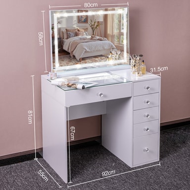 Dette sminkebord med smart spejl er lavet af kvalitetsplade og hærdet glas, sikkert og stabilt. Det måler 92 cm (L) × 55 cm (B) × 81 cm (H), med ergonomisk design der passer perfekt til daglig brug.