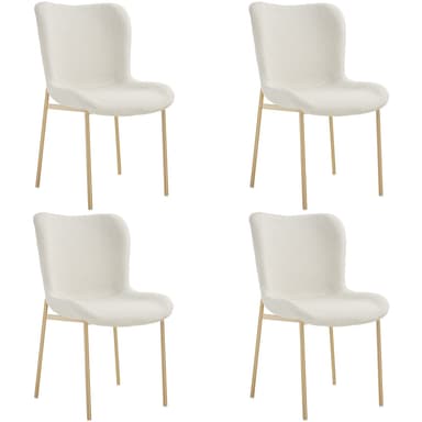 Spisebordsstolen Tessa med hyggeligt bouclé-stof fra tectake er en komfortabel blikfang til dit hjem. Denne spisebordsstol skiller sig ud med sin kombination af hvidt stof og slanke stålben i elegant guld, hvilket skaber en luksuriøs og moderne æstetik.