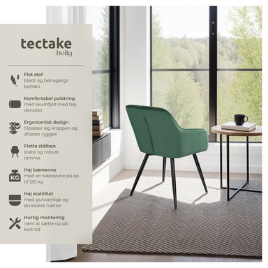 Med sin sofistikerede udstråling og bløde velouroverflade tilføjer stolen fra tectake et unikt præg til din boligindretning. Dens bløde, smukke betræk i velour udstråler varme og stil, mens de iøjnefaldende farver på sædet gør den til et naturligt blikfang i ethvert rum. Uanset om din indretning er moderne, klassisk eller minimalistisk, passer denne spisebordsstol perfekt ind og fremhæver rummets karakter.