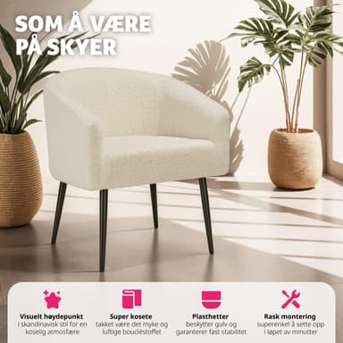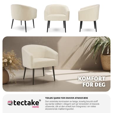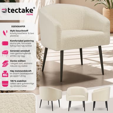 Den komfortable lænestol Mysig fra tectake er den perfekte loungestol til din stue. Dette luksuriøse møbel kombinerer skandinavisk design med fremragende komfort og passer sømløst ind i enhver eksisterende indretning. Den bløde bouclé-stof i beige giver dit rum en varm og indbydende atmosfære, mens det er behageligt at sidde på den ekstra tykke polstring i timevis.