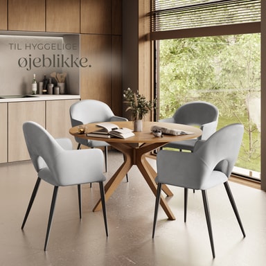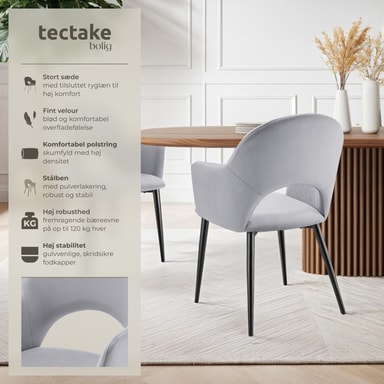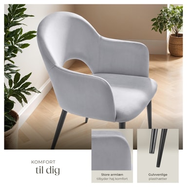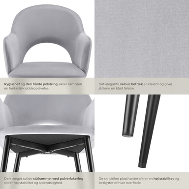 Sæderne på spisestuestolen imponerer med en elegant kombination af polstrede armlæn og et blidt buet ryglæn. Kombinationen med det bløde velour giver stolene ikke kun en særlig elegance, men også en yderst behagelig siddeoplevelse. Yderligere komfort giver dig den behagelige polstring med en fyldning af høj densitetsskum, der inviterer til lange, hyggelige timer ved spisebordet i disse spisebordsstole.