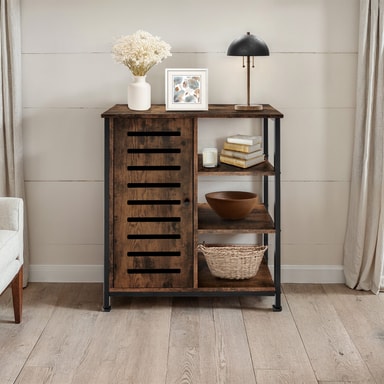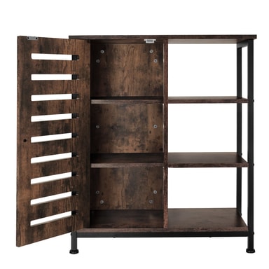 Varmt træ og koldt stål er de definerende modsætninger til denne karakterfulde skænk fra tectake. Det minimalistiske design med sine hjørner og kanter er en typisk repræsentant for industriel stil. Med den store hylde, de tre åbne rum og det høje skabsrum med to justerbare hylder på denne skænk giver det plejevenlige møbel alsidig plads på et lille fodaftryk. Den praktiske konstruktion kompenserer for ujævne gulve med sine fire fleksible skruefødder - giv dit hjem en rustik accent med denne smagfulde skænk i funktionel fabriksstil.