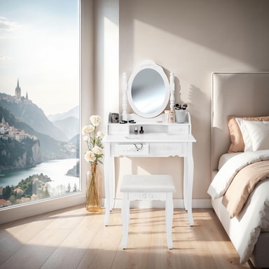 Dette sminkebord er ikke kun et optisk højdepunkt, men overbeviser også med sine praktiske egenskaber. Uanset om du bruger det som makeup bord eller som et elegant møbel, vil det skabe et elegant look.