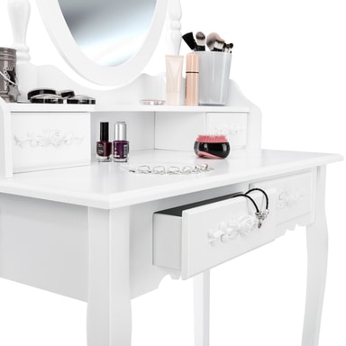 Makeup bordet imponerer med sin stabile og højkvalitets forarbejdning. De lette overflader sikrer, at dit sminkebord altid forbliver i bedste stand. Den polstrede skammel giver ekstra komfort.
