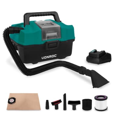 Denne kompakte universal støvsuger leveres med en akku og oplader, fordi den er en del af VONROC 20V Platform. Bestilling af udskiftelige 2,0Ah- eller 4,0Ah-batterier er valgfrit. Hvis du ønsker at kombinere støvsugeren med et andet produkt fra VONROC 20V-platformen, er et batteri og en hurtigoplader alt, hvad du behøver! Du skal blot vælge det du har brug for, til en konkurrencedygtig pris!