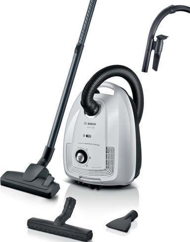 Den kompakte serie 4 fra Bosch er en højeffektiv pose-støvsuger, som er lavet i Tyskland, med flot design, som fremmer nem rengøring og tilgængelig håndtering. Den er kraftig og designet så dit tilbehør altid er lige ved hånden - for overbevisende resultater.