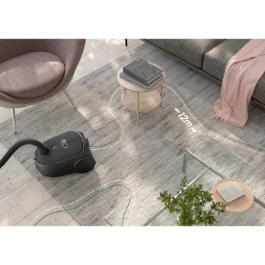 Støvsugeren er nem at manøvrere henover forskellige overflader og gulvtyper takket være 12 meters rækkevidde, så du har masser af frihed til at støvsuge selv større rum og mellem rum. Teleskoprøret er højdejusterbart, så brugen bliver komfortabel og praktisk.