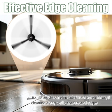 Effektiv kantrensning: 6 sidebørster medfølger for at sikre grundig rengøring langs vægge, samt i hjørner. Disse børster hjælper med at feje affald ind i hovedbørsten.