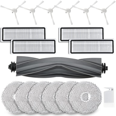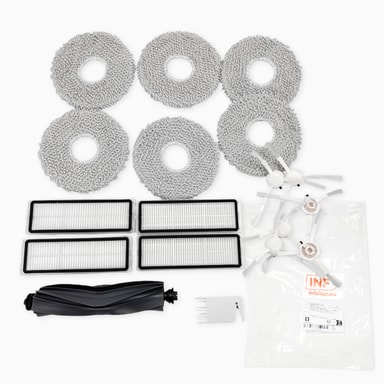 Tilbehørssæt med en række reservedele, der passer til robotstøvsugeren Dreame L10s / L10 Ultra. Indeholder hovedbørste (gummibørste), sidebørster, moppepuder og støvsugerfilter.