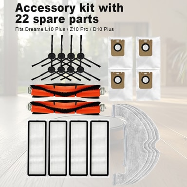 Tilbehørssæt med en række reservedele, der passer til Dreame L10 Plus / Z10 Pro / D10 Plus robotstøvsugeren. Indeholder hovedbørster, sidebørster, moppepuder, støvsugerfiltre og støvsugerposer.