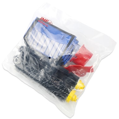 Passer til iRobot Roomba: Reservedelene indeholder et par hovedbørster (en med børster og en plastikbørste), tre kantbørster, tre filtre, et rødt blad og en rød rulle.
