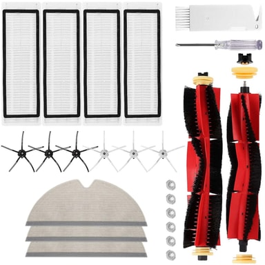 Sæt med 23 reservedele: Dette sæt indeholder forskellige børster, støvsugerfiltre, moppeklude og vandtankfiltre samt en skruetrækker og rensebørste.