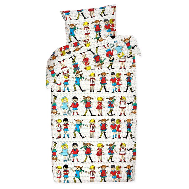 Vitt bäddset i 100 % bomull, helmönstrat med bäddset med bilder av Pippi och hennes vänner.