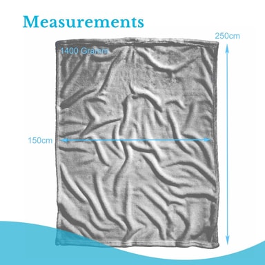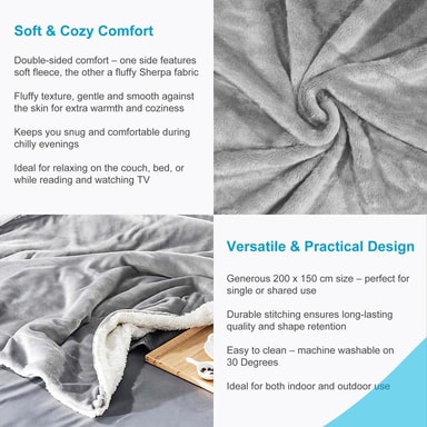 Materialet består af flannel fleece og sherpa fleece og måler 200 x 150 cm.