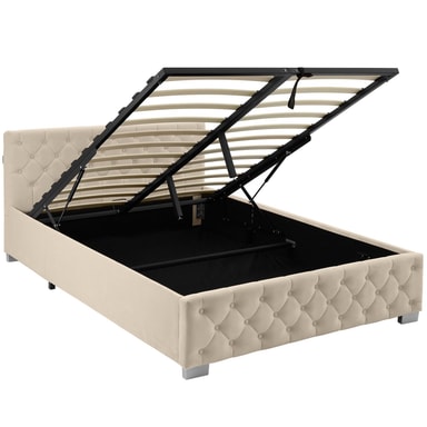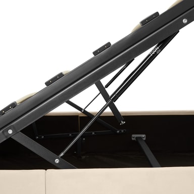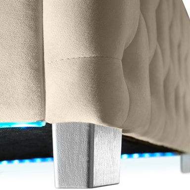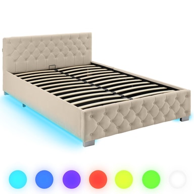 Via fjernbetjeningen sætter den integrerede LED-belysning sengen i fokus og skaber en indirekte lyskilde for en afslappet atmosfære. Den solide stålramme med pulverlakering sikrer stabilitet og høj bæreevne. Den robuste lamelbund af træ sikrer en optimal rygsøjleaflastning og kan let klappes op ved hjælp af gastryksfjedre for at bruge opbevaringspladsen nedenunder.