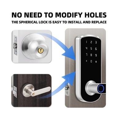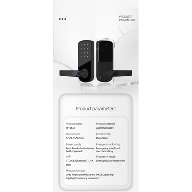 Sikr dit hjem med Smart Door Lock Fingeraftryk Tuya. Har TTLock Bluetooth, fingeraftryk, adgangskode, NFC, kort, nøgle og midlertidig adgangskodeoplåsning. Ideel til hjem, lejligheder, hoteller og skoler med indendørs trædøre.Læs mere om produktet