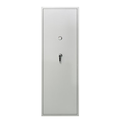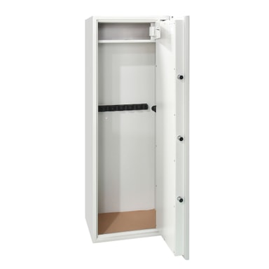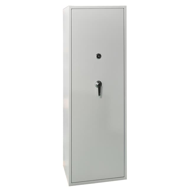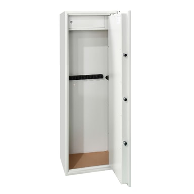 Rummeligt våbenskab i hvidt STCC koldvalset stål med separat ammunitionsboks, fem låsebolte, og overensstemmelse med EN 1143-1:2019, velegnet til sikker opbevaring af op til 10 våben.Læs mere om produktet