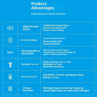 【Multifunktionel】 Kombinerer alarm-, lommelygte- og blinkende lysfunktioner i én enhed for omfattende personlig sikkerhed.