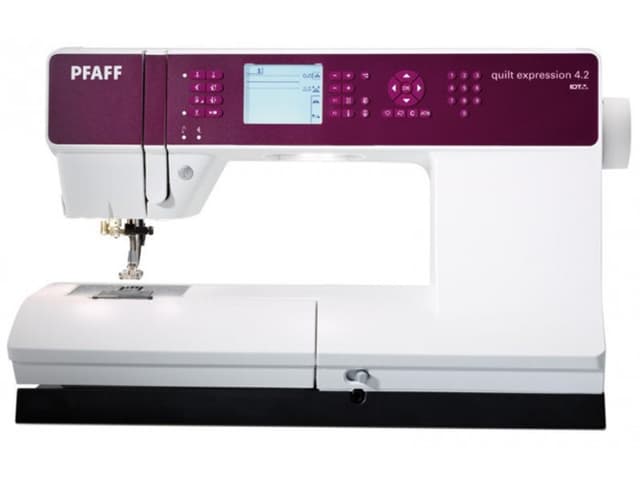 Pfaff Quilt Expression 4.2 Quilt Expression 4.2 er quiltarens favoritt, og en bestelgar til quilte og lappenteresserte.Funksjoner :maskinen har 254 sømmer blandt annet alfabet, quiltesømmer og automatisk knapphull. Maskinen er utstyrt med Pfaff sin velkjente IDT overtransportør for god komfort og har ett syrom på hele 250mm. Den har justerbar stinglengde opptil 5mm og stingbredde opptil 9mm. Quilt Expression 4.2 har innebygd nålitreder, og lang friarm og ett opplyst lettlest display. Elektronisk knelyft av trykkfot og hele 37 nålposisjoner. Maskinen har 20 eigne innstillingar for søm, og 20 minner for mønsterkombinasjonar og bokstavar. Maskinen gir beskjed når undertråden går tom, og har elektronisk trådspenning. Den kan speglvende sømmer, har nedsenkbar transportør og valfri nålstopp oppe/nede. Med start/stopp knappen kan en også uten fotpedal. 254 sømmer 2 alfabet Start/stopp knapp Elektrisk trådspenning Undertrådsensor Automatisk sensormatic knapphull nålitreder IDT overtransportør Lang Friarm Nedsenkbar transportørJusterbart trykkfottrykk 37 nålposisjoner 20 x 2 minner Norsk instruksjonsbok Ekstra høyt trykkfotsløft Utstyr Følger med flere syføtter, undertrådspolar, nåler, sprettekniv, hardplast koffert, kantlinjal, stor, medium og liten trådsnellestopper, multifunksjonsverktøy m.m