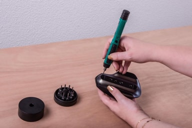 • Leveres med en holder, hvor bitsene opbevares. Du kan også bruge skruetrækkeren oprejst, så skruetrækkeren præsenteres på dit skrivebord eller arbejdsbord.