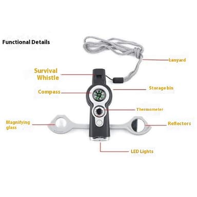 7-i-1 Whistle Survival Whistle med kompas / LED lys / forstørrelsesglas