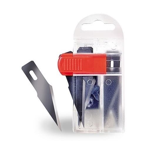 Sikkerhetsdispenser med 10 standard No5 knivblader. Settet gjør det tryggere å oppbevare og, når de er brukt opp, kaste bladene uten fare for kuttskader. Dispenseren lar deg enkelt skyve ut et og et ubrukt knivblad. Når et blad er brukt opp legges det ned i beholderens andre rom for brukte blader hvor det oppbevares trygt.