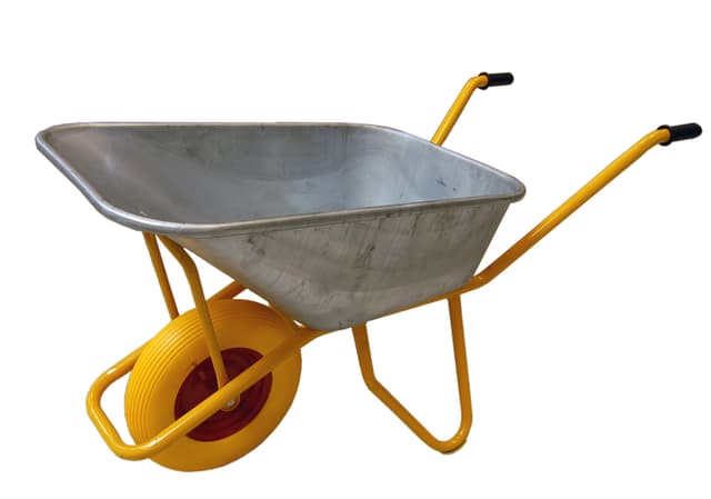 Punkterfri dæk af massiv PU-skum Galvaniseret kasse med 0,8 mm pladetykkelse og fuldsvejst ramme Dækstørrelse: 16"" - 4.00×8"" Aksel: 12 mm Fælg: stål med kuglelejer Maks. belastning: 150 kg / 110 l Leveres usamlet Øvrig info: Egenvægt: 13,4 kg Tykkelse på skålen: 0,8 mm Tykkelse på stellet: 30×1,25 mm