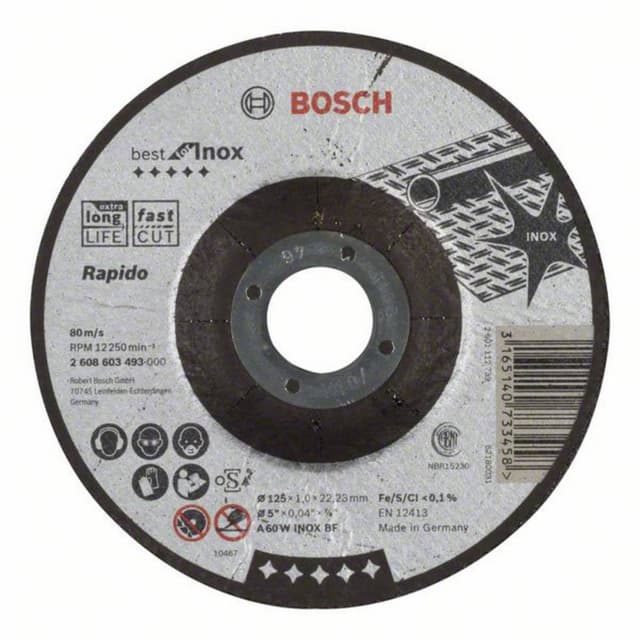 Skæreskiven Best for Inox har en fremragende levetid ved skæring i inox. Skiven har keramikindkapslet slibekorn. Dermed er den særligt slidstærk og sikrer en ensartet høj kvalitet ved minimal udgravning eller blå farveafsmitning. Skiven er fri for jern, svovl og klorerede fyldstoffer. Det præcisionsfremstillede glasfiberstof sørger for høj stabilitet og sikkerhed ved skæring. Brug denne skive til skæring af stål. Til vinkelslibere skæreskiver fra Bosch opfylder de højeste sikkerhedskrav som en 12413, FEPA og OSA. Specifikation: A 60 W INOX BF, diameter mm: 125, boringsdiameter mm: 22,23, tykkelse mm: 1,0 OBS! Denne produktbeskrivelse er endnu ikke blevet oversat til dansk af vores oversættere. Derfor er teksten maskineoversat fra den tyske originaltekst.