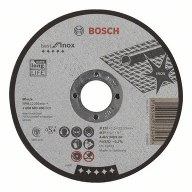 Skæreskiven Best for Inox har en fremragende levetid ved skæring i inox. Skiven har keramikindkapslet slibekorn. Dermed er den særligt slidstærk og sikrer en ensartet høj kvalitet ved minimal udgravning eller blå farveafsmitning. Skiven er fri for jern, svovl og klorerede fyldstoffer. Det præcisionsfremstillede glasfiberstof sørger for høj stabilitet og sikkerhed ved skæring. Brug denne skive til skæring af stål. Til vinkelslibere skæreskiver fra Bosch opfylder de højeste sikkerhedskrav som en 12413, FEPA og OSA. Specifikation: A 46 V INOX BF, diameter mm: 125, boringsdiameter mm: 22,23, tykkelse mm: 1,5 OBS! Denne produktbeskrivelse er endnu ikke blevet oversat til dansk af vores oversættere. Derfor er teksten maskineoversat fra den tyske originaltekst.
