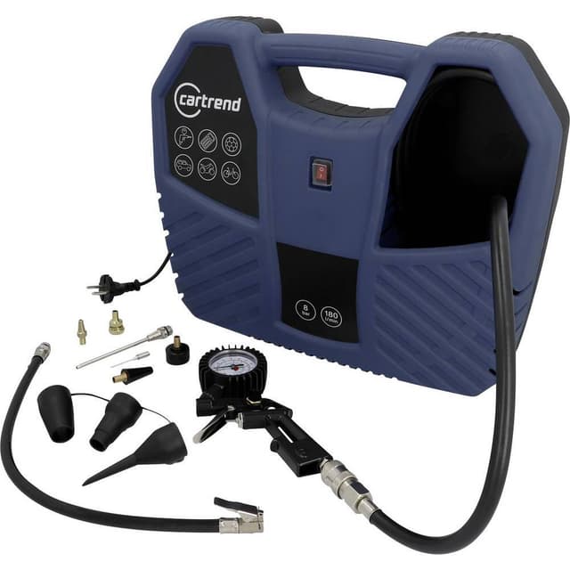 Kompressoren er en lille, mobil trykluft-kompressor i et praktisk kuffertdesign. Det lette og kompakte design overbeviser med en ergonomisk bærekomfort, så kompressoren til enhver tid kan anvendes mobilt og samtidig opbevares pladsbesparende. Kompressoren drives af en olie- og servicefri motor og tilbyder dermed en lav vedligeholdelse. Anvendelsesmulighederne for kompressoren med maksimalt 8 bar tryk er brede, for eksempel oppumpning af bil- og cykeldæk, bolde, svømmebassiner og luftmadrasser, samt ud- og afblæsning af emner, overflader, kabinetter og motorer på værkstedet. I leveringen medfølger en trykluftpistol, en dækpåfyldningsmåler og et adapter-sæt i 8 dele samt en 3 meter lang trykluftslange med lynkobling. Et praktisk opbevaringsrum til tilbehøret er integreret i kabinettet. OBS! Denne produktbeskrivelse er endnu ikke blevet oversat til dansk af vores oversættere. Derfor er teksten maskineoversat fra den tyske originaltekst.