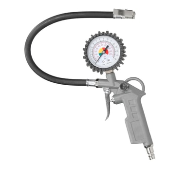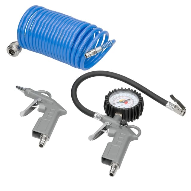 Det kan bruges til udblæsning, til kontrol af dæktryk og til påfyldning af køretøjsdæk. Alle enheder har en hurtig koblingstilslutning. Den medfølgende spiralslange er udstyret med en detaljeret knækbeskyttelse på ind- og udløbskoblingen.