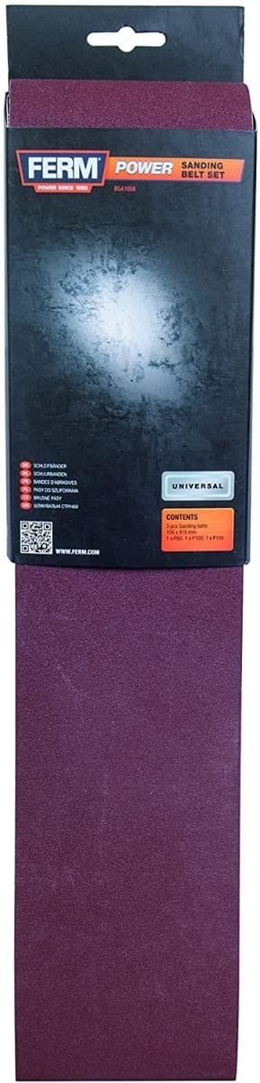 FERM BGA1060 er et slibebåndssæt i 3 dele (P100), der passer til BGM1003. Slibebåndene har en størrelse på 915x100 mm.