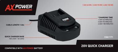 FERM CDA1171 er en hurtiglader til 20V AX-Power batterier, designet til at oplade dine værktøjsbatterier hurtigt og effektivt. Med LED-indikator og kompatibilitet med flere batterityper, er denne lader et uundværligt tilbehør til alle, der arbejder med FERM elværktøj.